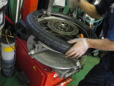 ホイールの内側をキレイに磨きながら新しいタイヤを組み付けていきます(^_^)