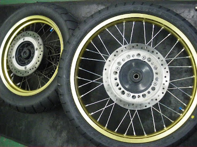 複数所有の車両の中からアフリカツインのスポーク張替、タイヤ&ベアリング交換をさせていただきました!