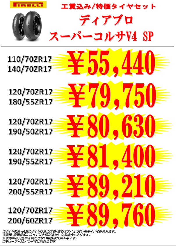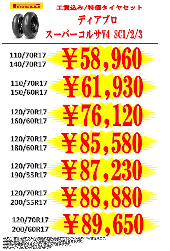 工賃込み・特価タイヤセット ディアブロスーパーコルサ V4 SC1/SC2/SC3